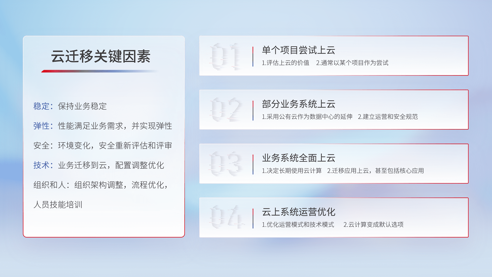 结合实际业务,,,从规划设计、、、云平台选型、、、、云原生改造、、、数据迁移、、、集成交付,,迁移全过程为客户识别最佳上云路径,,,做好风险识别管理,,,,设计网络架构、、、身份权限、、、安全审计合规、、、、操作审计、、、、日志审计、、监控告警策略、、多站点容灾设计等,,对云上基础设施进行整体规划,,,,提升IT治理水平,,,以满足弹性、、、、高可用、、高性能的需求。。